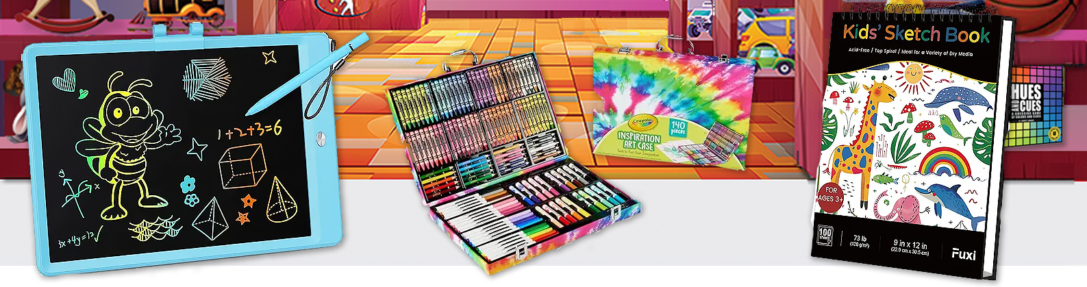 Products featured here are "Arts and Crafts Drawing focused" They generally include core supplies like pencils (graphite, colored), pens (fine liner, dip, gel), markers, and pastels, along with surfaces (sketchbooks, paper, canvas) and tools (erasers, sharpeners, rulers, blending stumps), covering everything from basic crayons for kids to professional inks, charcoals, and digital tablets for advanced artists, all designed to create lines, shades, and colors.