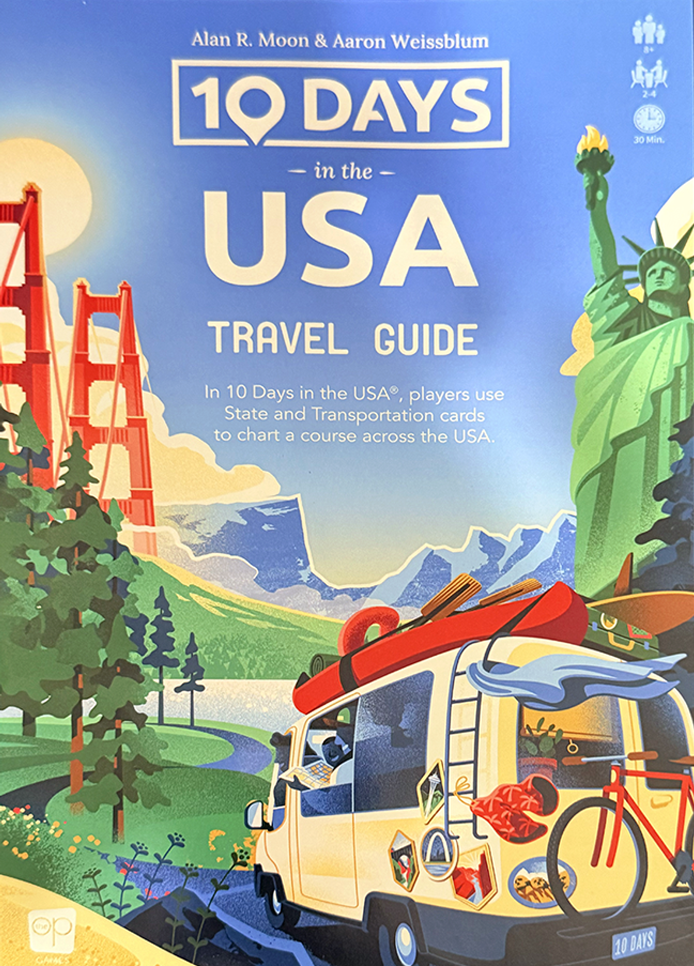 10 DAYS in the USA is takes a new approach to game Play. In the game you have to travel the country by jet, car, and on foot, based upon the cards you have or draw from the stack. This is accomplished using destination and transportation tiles. With a little luck and clever planning, you just might outwit your fellow travelers.