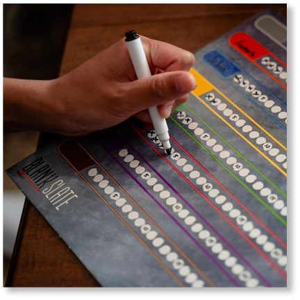 The players tally up the scores accordingly -3 points for pairs of matching words, 1 point for more than two people that match and 0 points for any unmarked word - and mark the player score track on theScore Board.