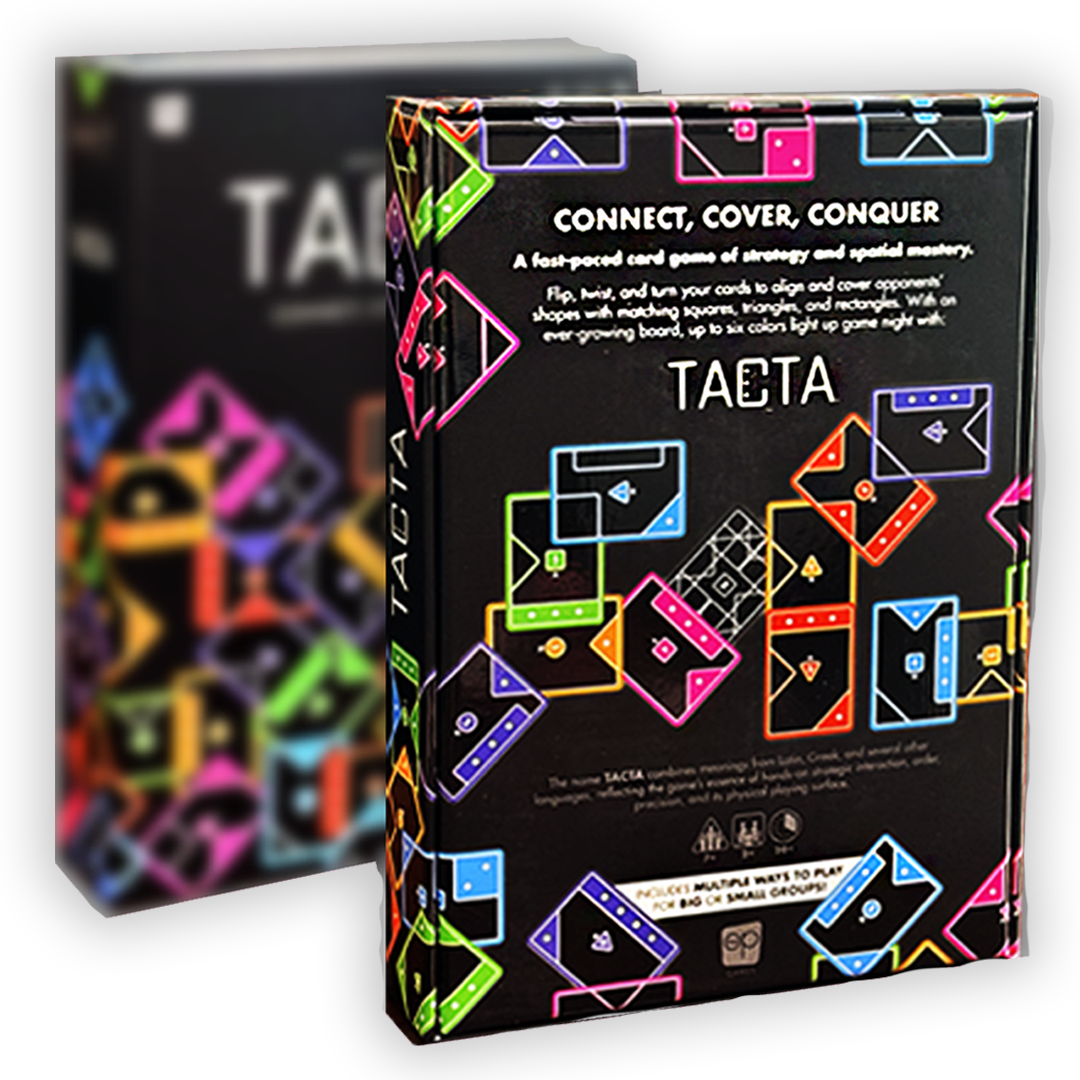 TACTA™ is probably one of the most addictive games you will ever play! It's all connected! In this sneakily strategic card game, players flip, twist, and turn their cards to align and cover their opponents' shapes with matching squares, triangles, and rectangles.