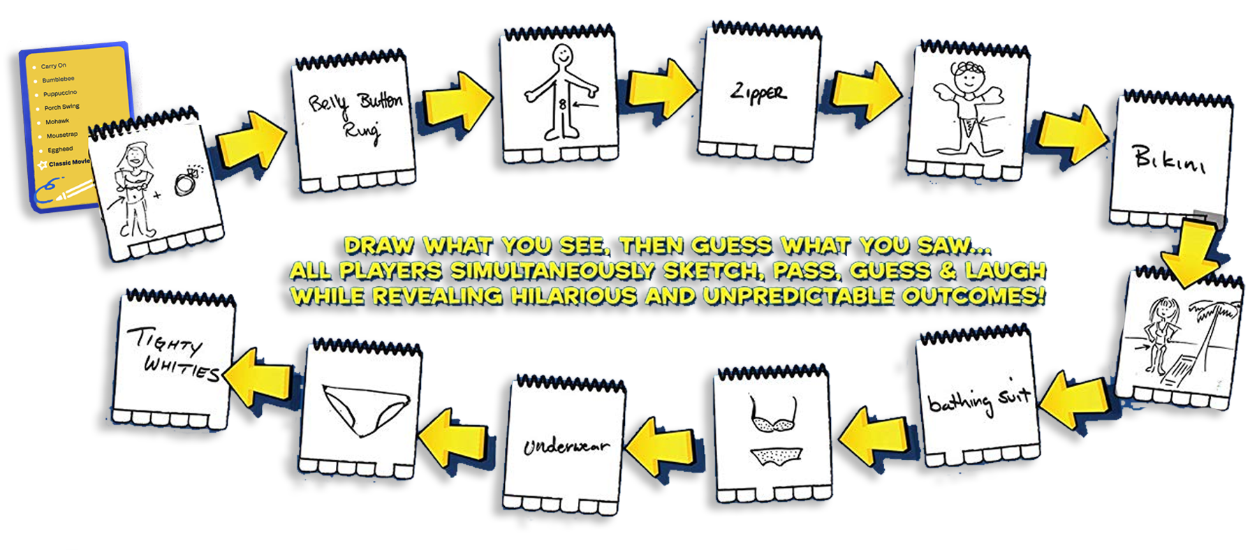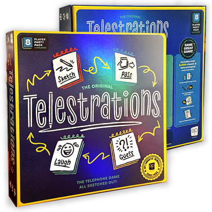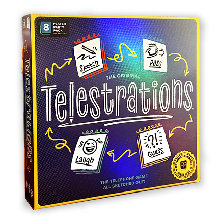 "With Telestrations® you guess what a person drew, then draw what they guessed, and see how funny the changes get! will get your family and friends laughing as they draw what they see, then guess what they saw for hours of hilarious miscommunication. All players simultaneously sketch, pass, and guess while revealing laugh-out-loud and unpredictable outcomes!"