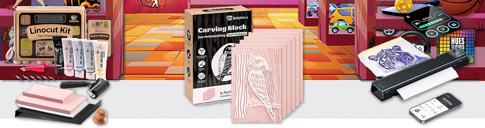Products featured here are "Arts and Crafts Print Making focused." They generally include speedball kits, linoleum cutters, brayers, specialized papers, and fabric inks, Key items are carving tools, rollers, presses, inks (oil/water-based), paper (printmaking, fabric), and kits for beginners.